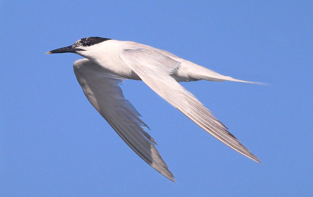 Sandwich terns are known to prey on fish. Bird in picture was spotted close to the shoreline on windy day.