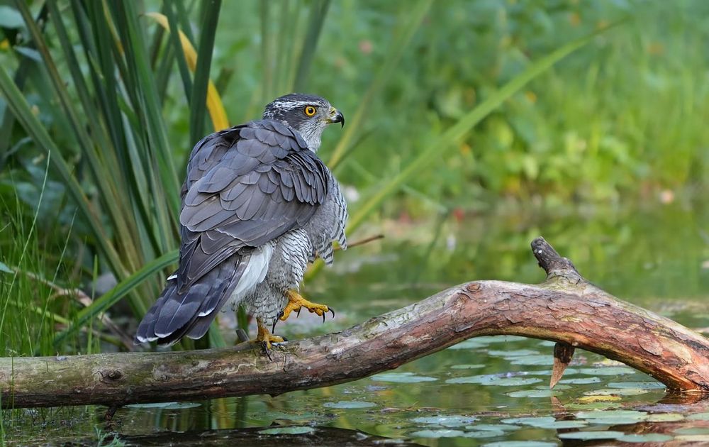 Fraaie Havik bij een bosmeertje. Nu met het droge warme weer komen verschillende roofvogels, waaronder deze Havik een bad nemen.