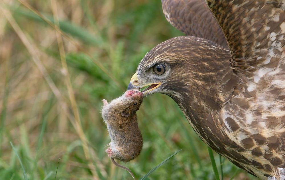 Vanaf een uitkijkpunt viel de Buizerd ineens het gras in naast me en had een muis te pakken