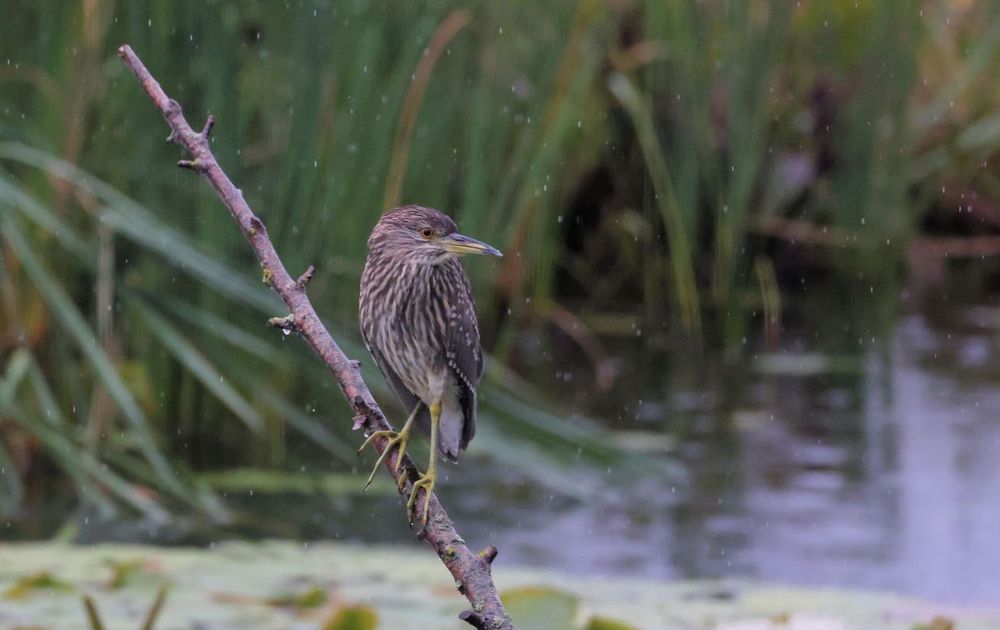Op een dag dat je denkt dat de camera ingepakt kan blijven blijk ik misschien wel de knaller van het jaar te scoren. En wel vanachter de eettafel door dubbel glas fotografeer ik in de regen op deze donkere dag een juveniele KWAK in onze tuin. Deze bijzondere waarneming is mijn 138e vogelsoort in onze tuin, een paradijs in het Groene Hart.