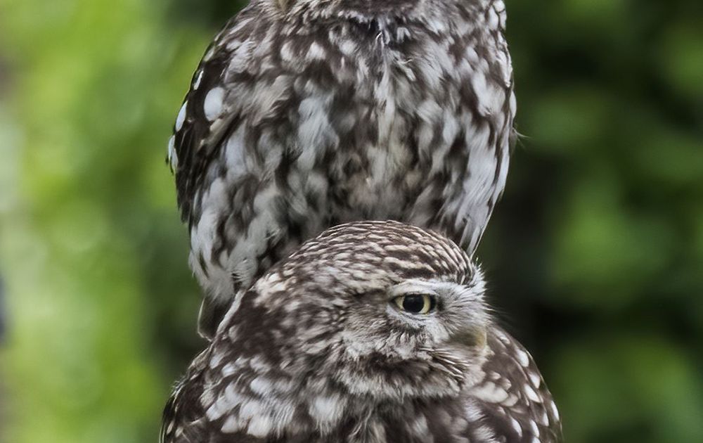 Deze twee steenuiltjes zaten samen op een hek bij een boerderij, waarschijnlijk uit te rusten van een vermoeiende bezigheid. Hun rust werd wreed verstoord toen de er een auto het erf opreed en de rustende uiltjes opjoeg.