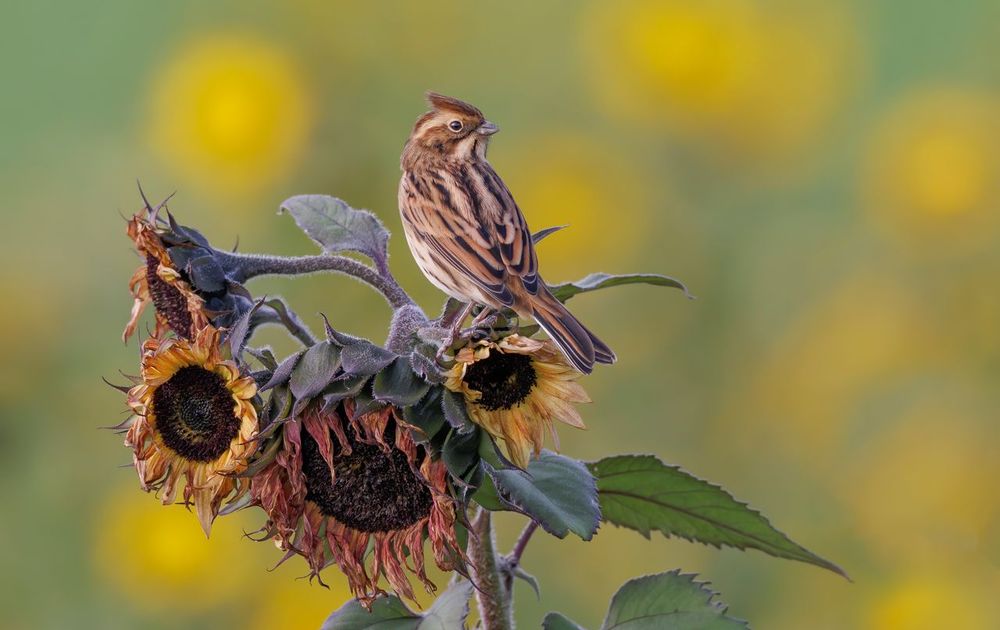 Rietgors zit op uitgebloeide zonnebloemen, de wind blaast zijn kuifje ophoog.