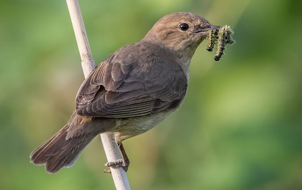 500mm, 1/800 sec, f6.3, iso 800. Deze tuinfluiter maakte een korte tussenlanding op een rietstengel en keek even achterom. Net lang genoeg om 'm vast te leggen met een snavel vol rups!