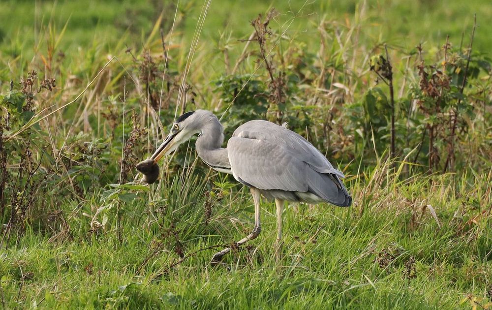 Niet langs de slootkant aan het jagen, maar midden in een weiland.