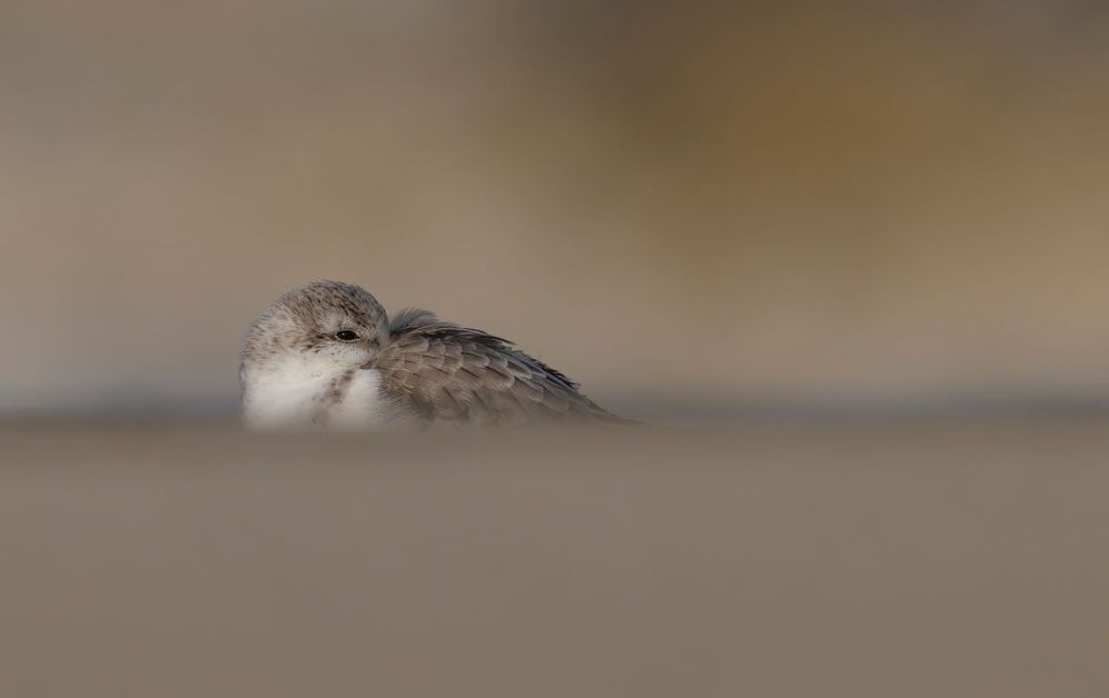 Deze foto heb ik genomen op 16 november op het strand van Terschelling, de omstandigheden waren uitdagend, een snijdende, zandstralende, oosten wind met een gevoelstemperatuur van rond het vriespunt. Voor het lage standpunt heb ik een tijdje plat op mijn buik gelegen, waardoor je, ook door het verstuivende zand een prachtig voor- en achtergrond bokeh krijgt. De achtergrond wordt gevormd door de binnenrollende golven in de branding.