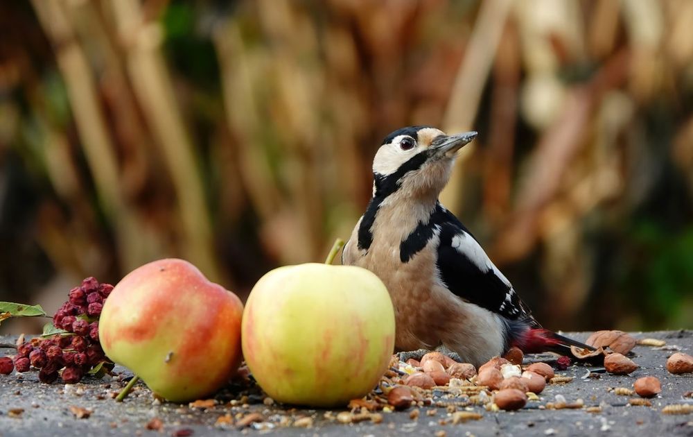 De grote bonte specht heeft onze voedertafel weer gevonden.