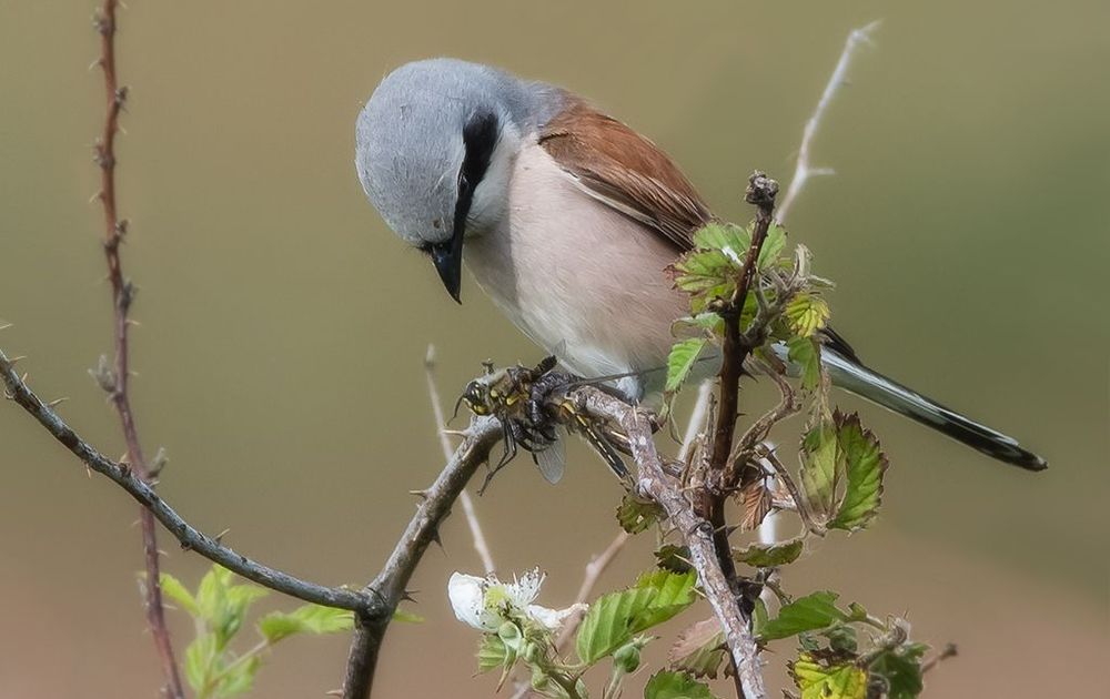 Dit mannetje grauwe klauwier heeft een libel gevangen en begint aan de maaltijd.