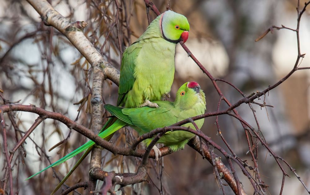 Parende halsband parkieten in de boom achter mijn balkon.