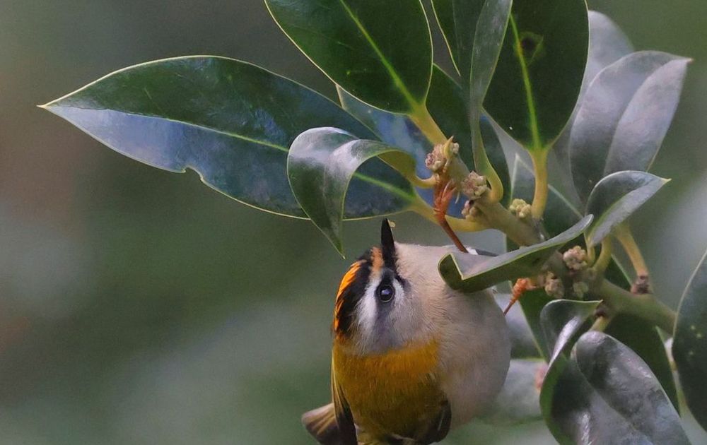 Dit kleine vogeltje zat soms verstopt achter een blad van de hulstboom op zoek naar iets eetbaars. Op de foto is te zien dat hij een minuscuul hapje te pakken heeft. Dan ben je wel even bezig voordat je een maaltje bij elkaar gescharreld hebt. Een enkele keer tref ik een Vuurgoudhaan aan in de tuin en in voorgaande jaren waren dat altijd vrouwtjes. Dit is de eerste keer dat ik een mannetje Vuurgoudhaan in de tuin zag foerageren. Geweldig.