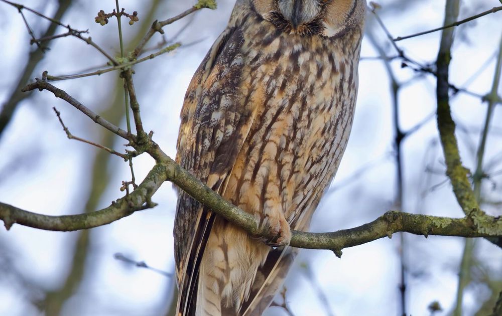 Van een oud-collega kreeg ik een tip over een locatie waar ransuilen zouden zitten. Op een hele andere plek kwam ik uiteindelijk een groepje tegen in een tuin. Van de vriendelijke bewoners mocht ik even in de tuin gaan fotograferen. Het was zwaar bewolkt weer, wat prettig is want volle zon geeft vaak scherp contrast. De loodgrijze lucht contrasteert juist mooi met de geelbruine kleur van de uil.