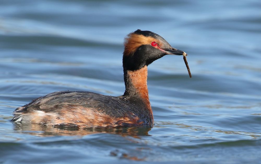 Deze kuifduiker was al vroeg in zijn zomerkleed (begin april). Regelmatig dook hij onder om even later weer boven water te komen met meestal een kokerworm.