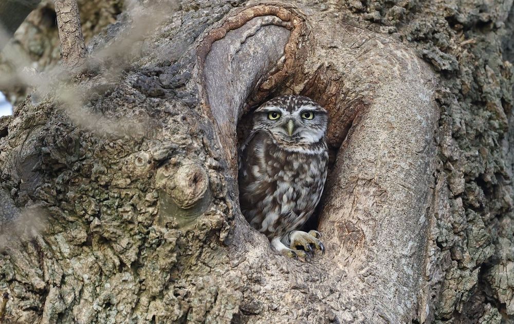 Alleen het paartje Kauwtjes verstoort de rust van de Steenuil. Auto's, (brom)fietsersen en wandelaars die de vogel op een paar meter afstand passeren, doen hem niets. Wat een beest.