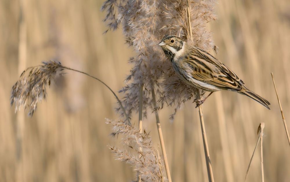 Mannetje Rietgors volop foeragerend in en op de rietpluimen