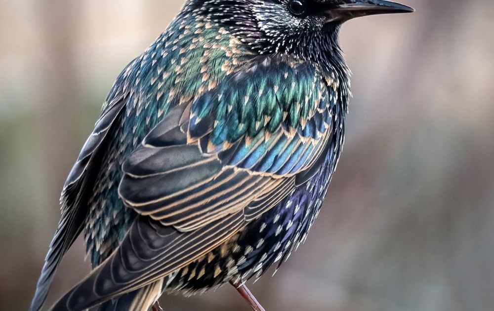 Zo op de rug gezien toont deze spreeuw z'n winterkleed in de meest ongelofelijke kleuren.