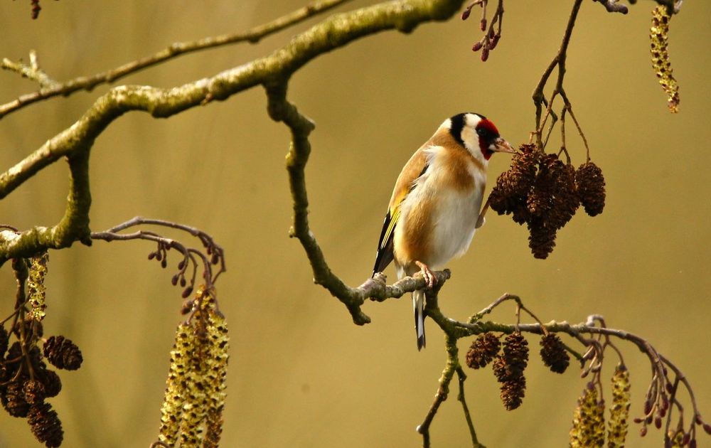 Zo een mooie vogel met mooie felle kleuren. Hier staat hij op 1 pootje de andere houdt de maaltijd vast......