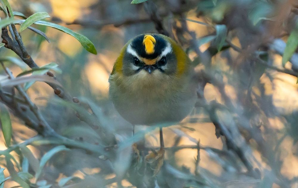 Deze vuurgoudhaan keek alsof ie op heterdaad betrapt was terwijl hij druk aan het foerageren was. Ik kon 'm maar net tussen de takjes en blaadjes door zien.