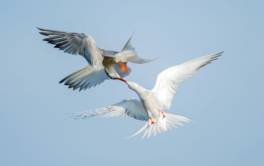 Wat zouden ze aan het doen zijn, deze twee visdieven? Het ziet eruit als een complexe doch liefdevol uitgevoerde dans, een ballet vol ingewikkelde achterwaartse salto’s, kopjes-voorover en een even subtiel aanraken van heloranje snavels. Een balts? “Niets is minder waar”, helpt fotograaf Jeroen Stel ons uit de droom. “Deze vechtende visdieven voeren een keiharde strijd om de beste plekken om een nest te bouwen. Zowel mannetjes als vrouwtjes halen de gekste capriolen uit tijdens zo’n luchtgevecht. Deze foto heb ik gemaakt op Texel, bij natuurgebied De Petten op het zuiden van het eiland. Vanaf de openbare weg heb je prima zicht op het gebied met eilandjes en brakke plassen, waar honderden kokmeeuwen, bontbekplevieren, kluten, noordse sterns en visdieven komen broeden. Net achter de dijk gelegen is het een uitstekende plek om visdieven in actie te fotograferen; ze vliegen met visjes af en aan van zee naar nest. Ik neem hier in het voorjaar graag mensen mee naartoe voor een 1-op-1 workshop vogels fotograferen. We beginnen dan met lummelende lepelaars en bouwen het op naar vechtende visdieven.