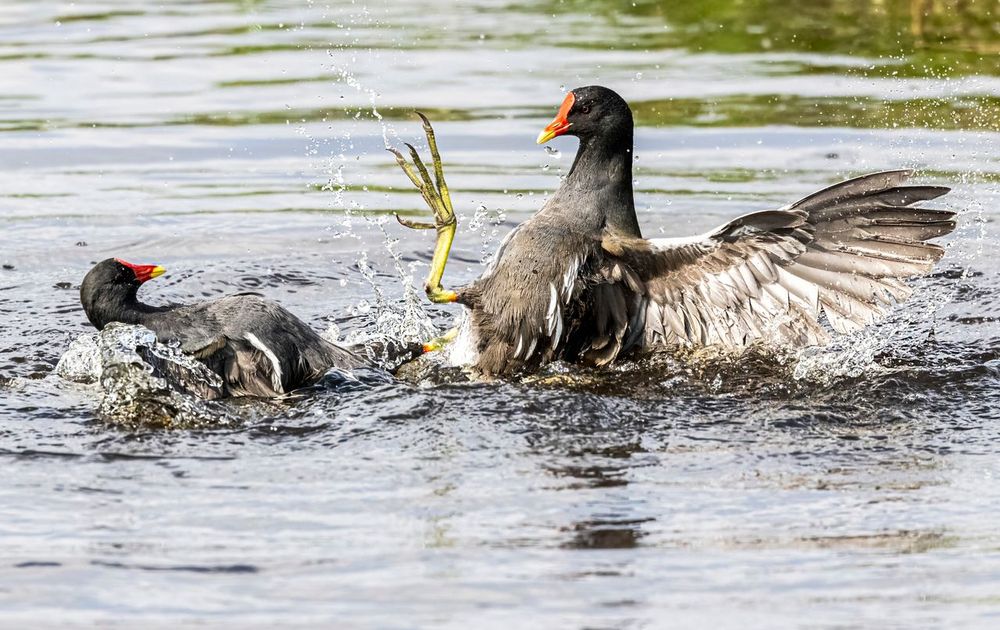 Twee mannetjes hebben ruzie. Waar zou dat over gaan? Het vrouwtje zwom iets verderop in het slootje, rustig afwachtend wie als winnaar te voorschijn zou komen.