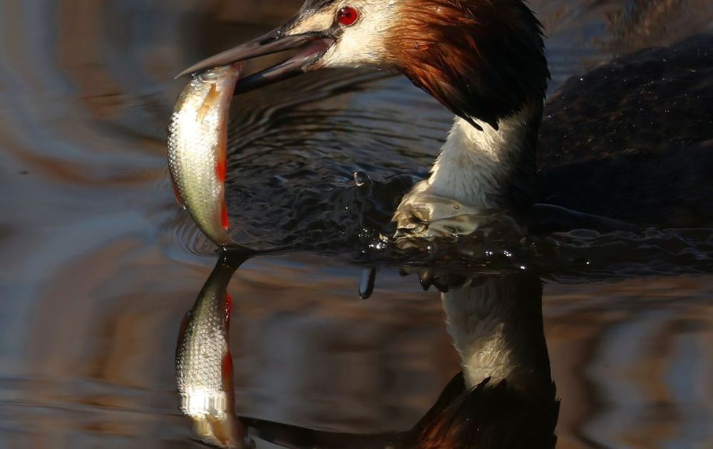 De futen zijn druk met vissen om de drie kleintjes te voeren. Als de vis een maatje te groot is eten de oudervogels de vis op. Foto, thuis in alle vroegte genomen.