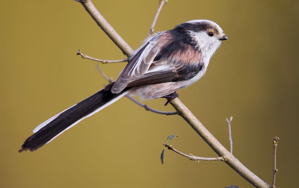 Deze staartmees kwam mooi dichtbij, de treurwilg erachter gaf een rustige gelige achtergrond.