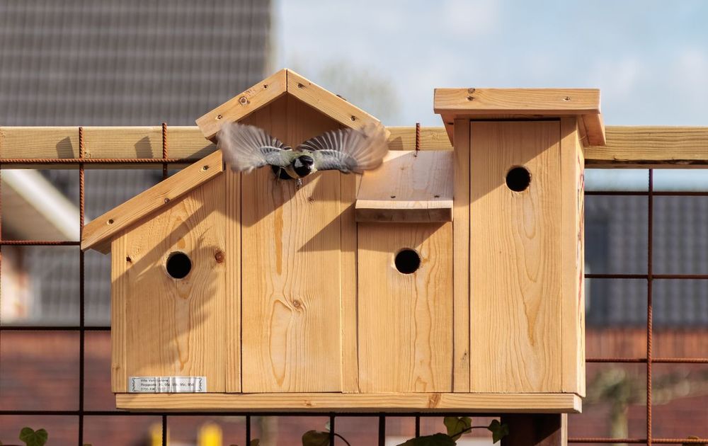 Deze foto gemaakt in het kader van "Vogels in je tuin." Wij wonen net een half jaar in onze nieuwbouwwoning in een nieuwe wijk en hebben onze tuin ingericht met een aantal nestkastjes. Een vriend van ons heeft dit "Vogelhotel" gebouwd en aan ons cadeau gedaan. Tot onze grote vreugde nestelde er zich direct een koolmees familie. Er zijn nu jongen en zij vliegen af en aan om deze te voeden en trekken zich niets aan van de omgeving.