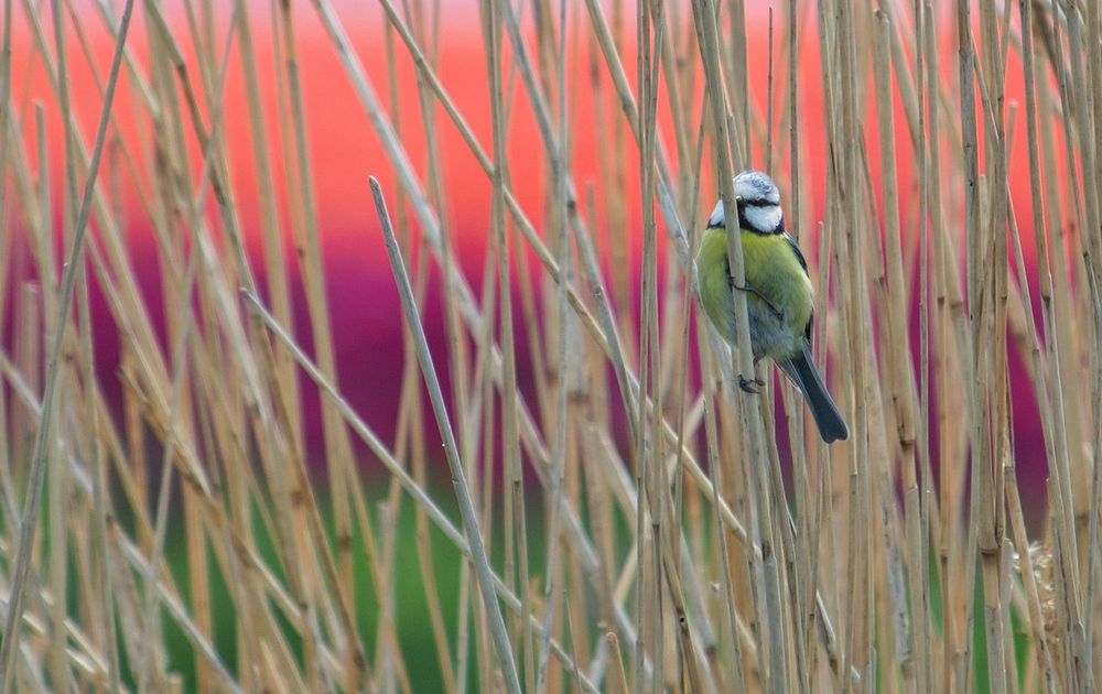 Deze pimpelmees zat in het riet insecten te zoeken. Op de achtergrond kun je de kleuren van de bollenvelden zien