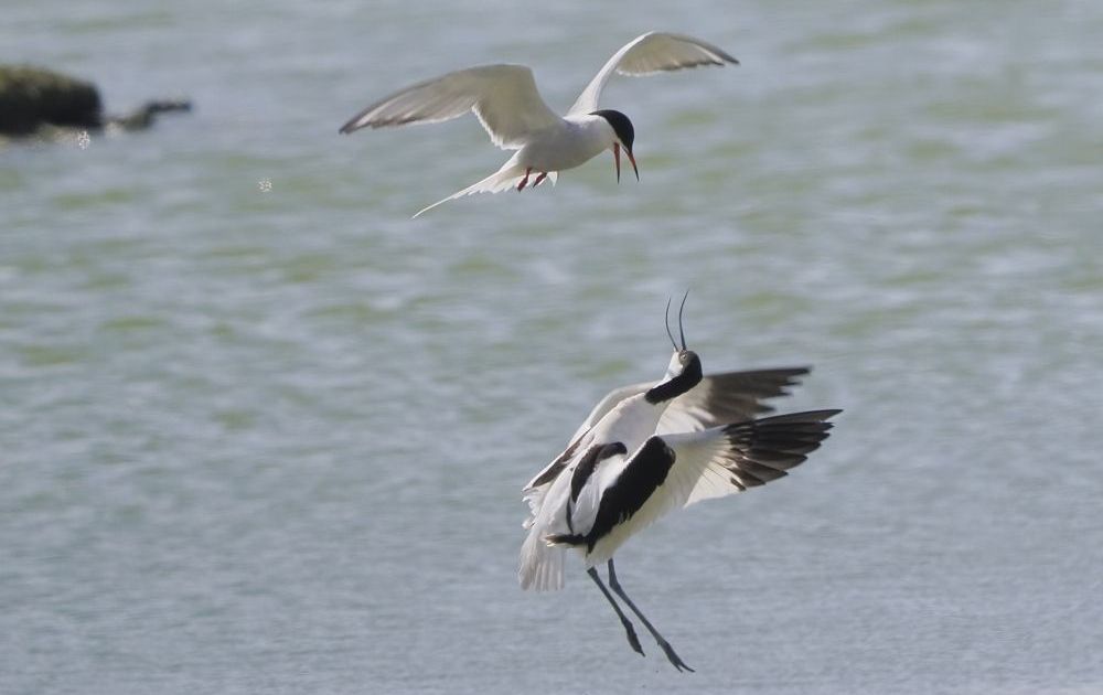 Een kluut en twee visdieven maakten ergens stevig ruzie om.