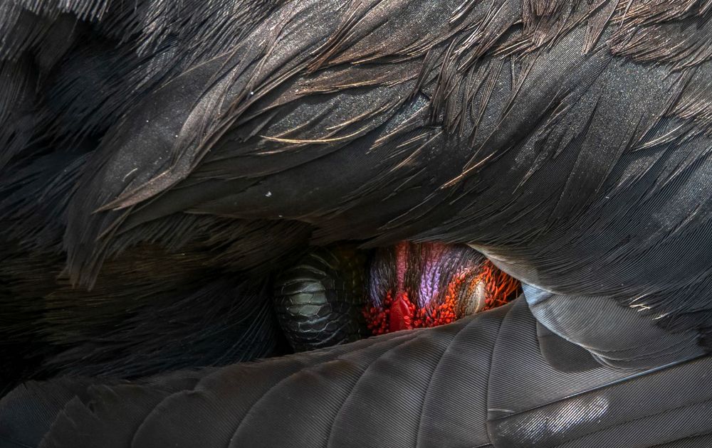 Ik heb een tijdlang bij het nest van deze meerkoeten gezeten. De jongen waren net uit het ei gekropen. Er lag nog 1 ei onder moeder en er waren al 7 jongen. Op een gegeven moment tilde moeder haar vleugels een klein beetje op zodat dit jong in beeld kwam. Toen ik deze foto bekeek vond ik de hele compositie ook wel op een oog lijken, waardoor de foto iets abstracts krijgt.