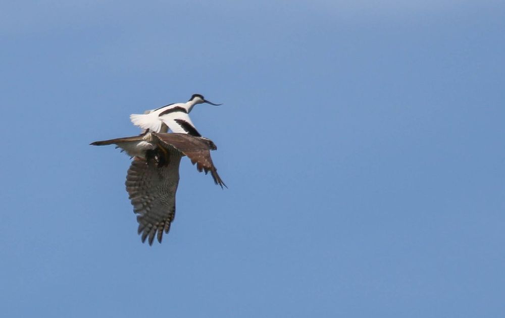 Kluut probeert jong te redden van havik maat tevergeefs.