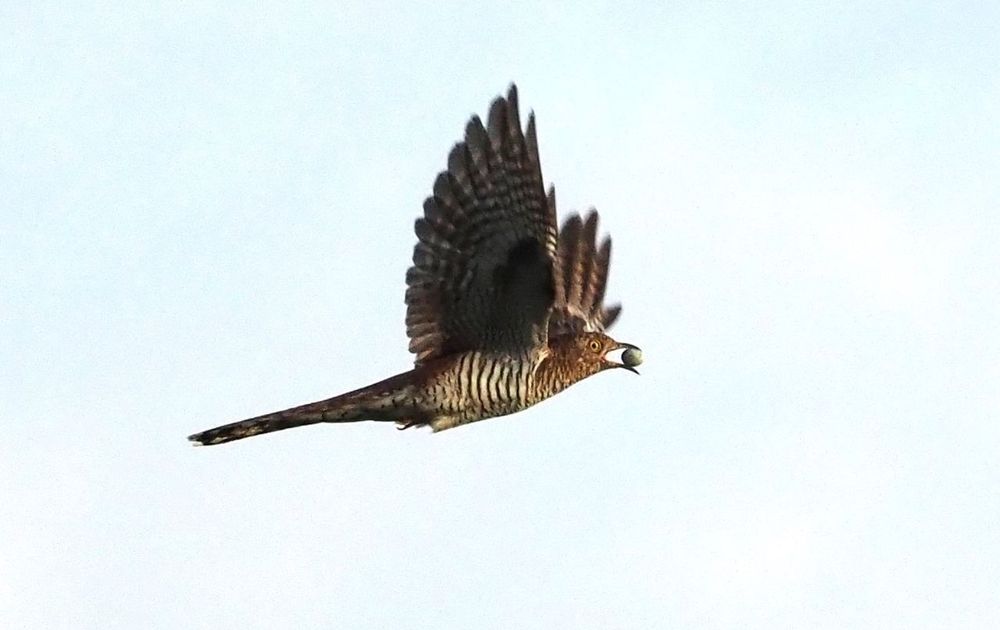 Deze koekoek vloog vlakbij mij de rietkraag in, een blauwborst vloog allarmerend op. Even later vloog de, bruine vorm, koekoek weer op, met dit blauwborst ei in zijn bek.