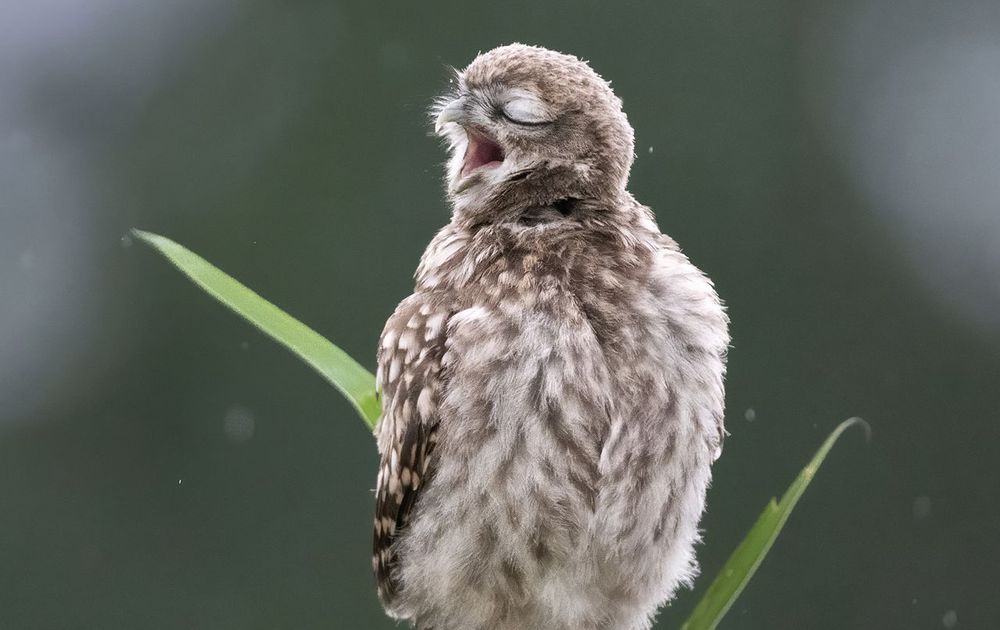 Jonge steenuil in een van de eerste regenbuien die hij meemaakt. Het lijkt alsof hij uit volle borst onder de douche aan het zingen is.