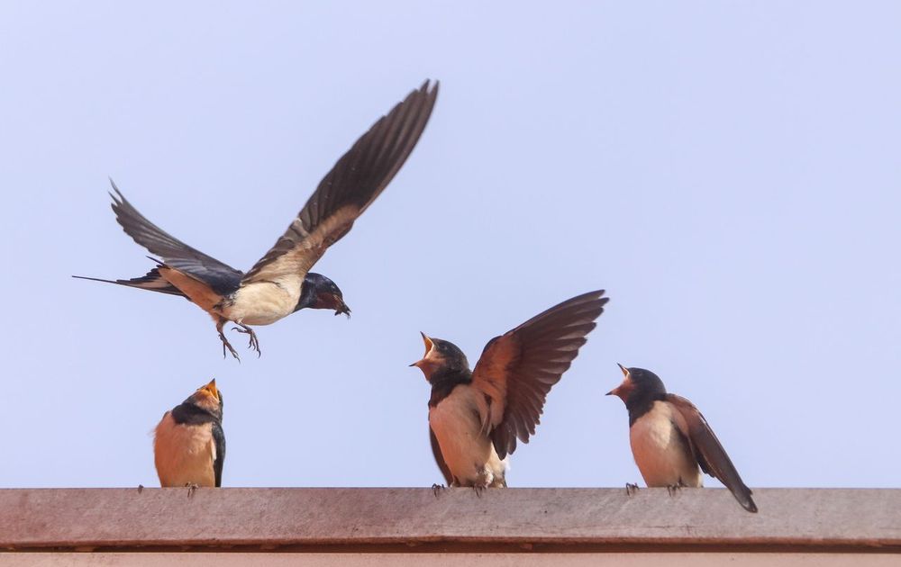Juveniele boerenzwaluwen worden gevoerd.
