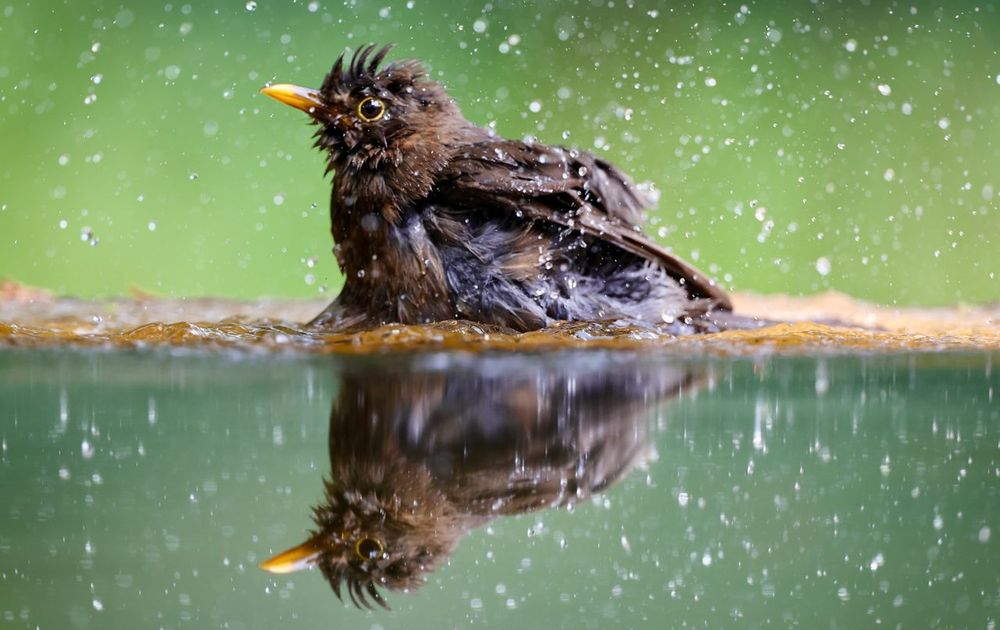 Tijdens een zonnige dag neemt deze jonge Merel een heerlijk verkoelend bad. Het water spettert overal heen!