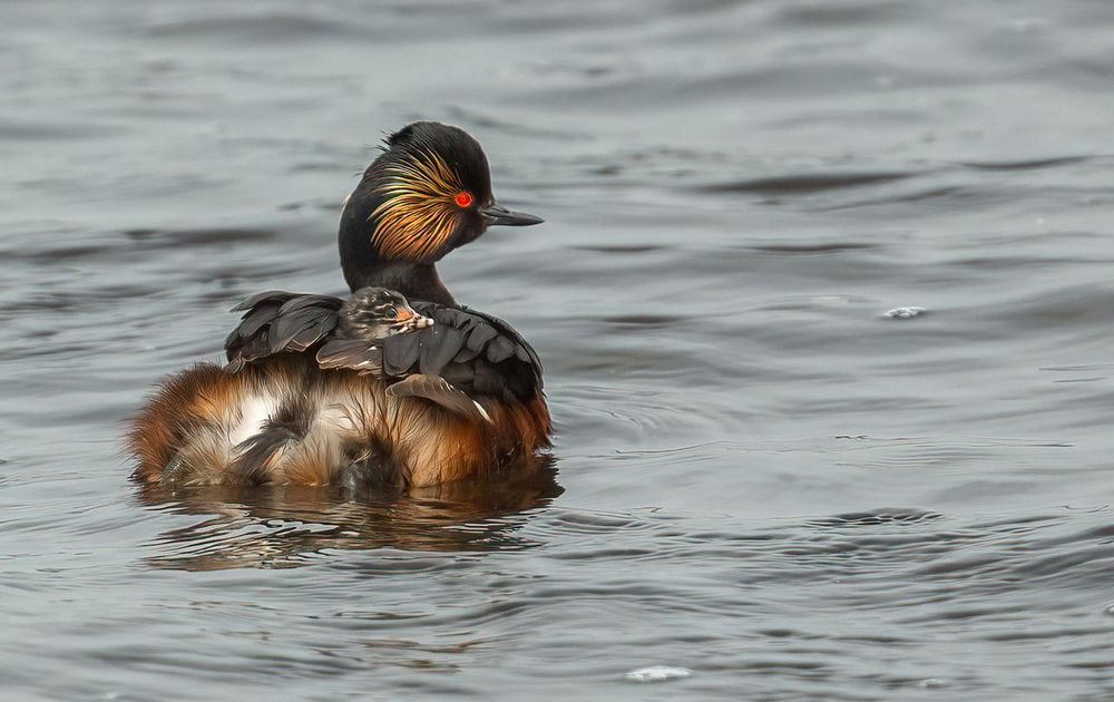 Twee jonge geoorde futen zaten op de rug van één van de ouders. De andere ouder kwam regelmatig voedsel brengen voor de kleintjes. Mooi om dit een tijdje van dichtbij te kunnen volgen.