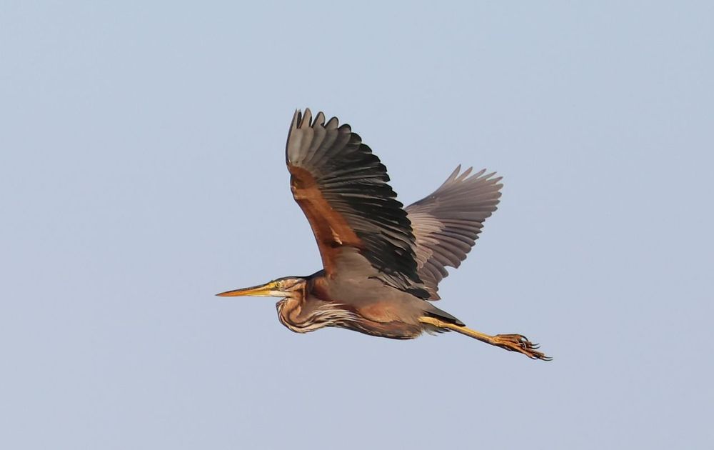 Geen spectaculaire foto van een vogel maar een foto van een vogel in al zijn eenvoud. De prachtige kleuren van de Purperreiger op onder-en bovenvleugel zijn mooi zichtbaar.