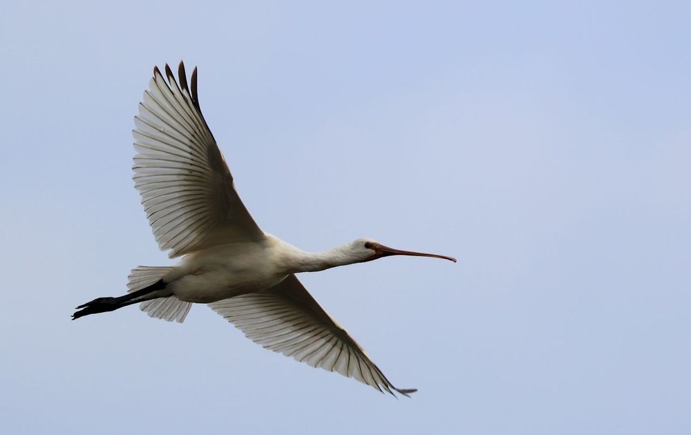 Deze juveniele Lepelaar zit goed in de veren en zijn mooi zichtbaar zo met zijn vleugels wijd uit. Kenmerkend voor deze jonge Lepelaar zijn de zwarte handpennen en zijn korte roze lepeltje.