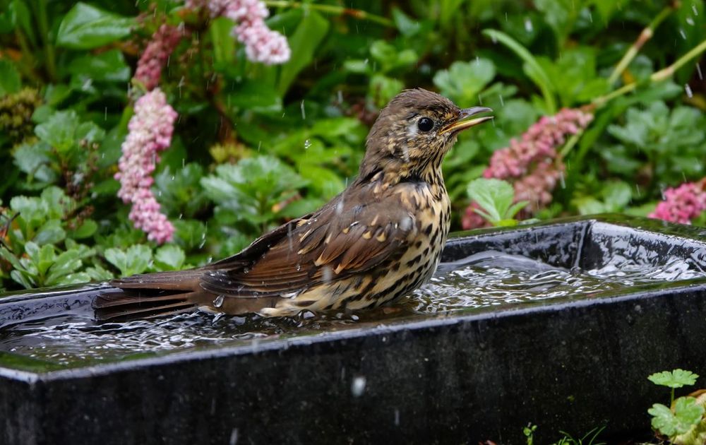 De zanglijster genietend van een bad in onze achtertuin vanmorgen. Rouveen, 2 september 2023