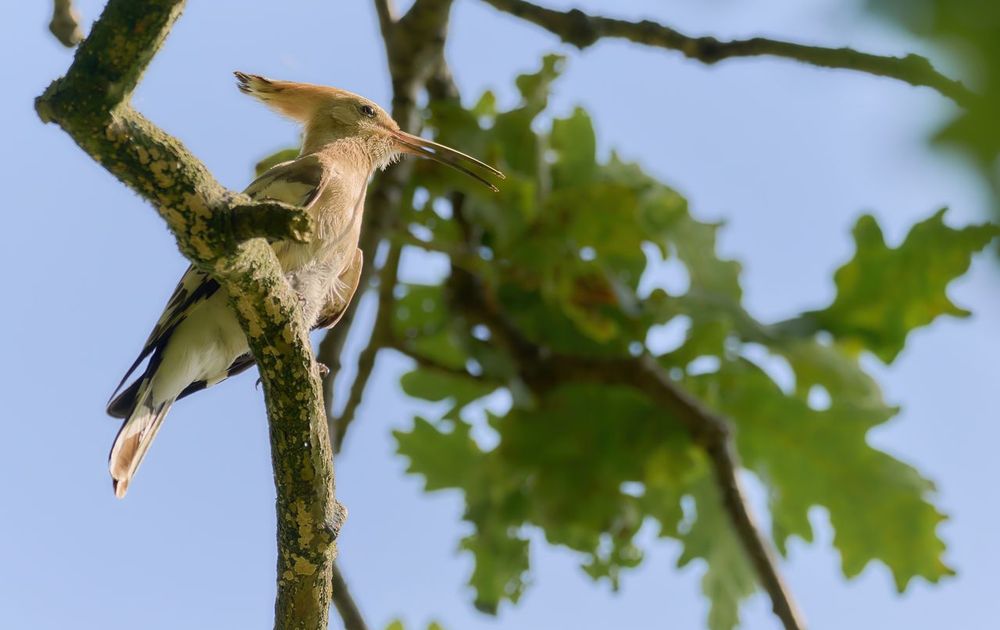 Op een omheinde weide in Rijswijk heeft deze Hop het aardig naar de zin met al het voedsel wat daar te vinden is. Heel even schrok hij op van een paar reigers en vloog in een boom.