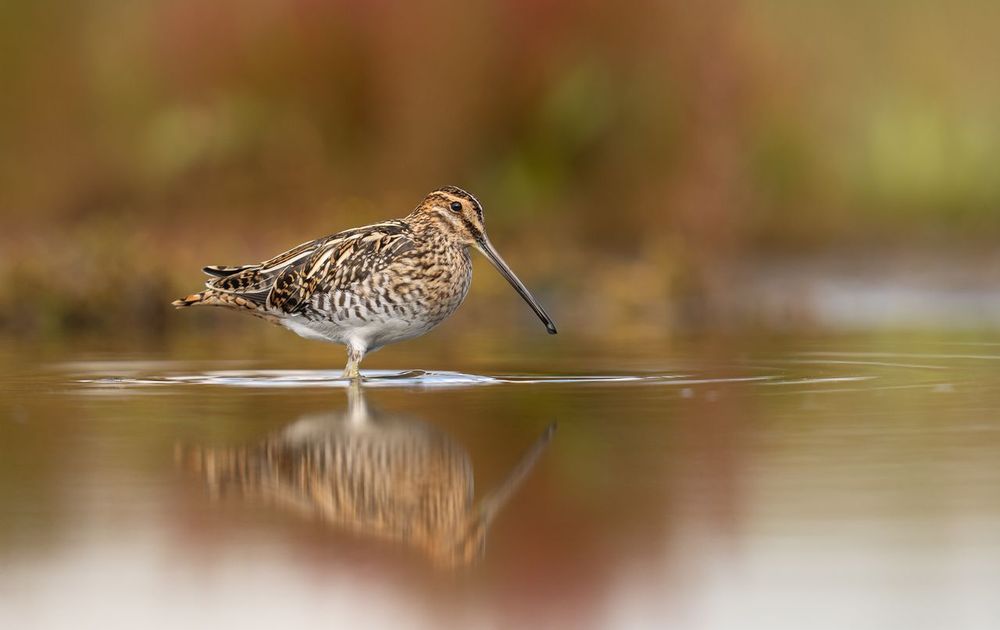 Eind september kleurde de vegetatie in de achtergrond al in mooie herfsttinten. In een schuilhut zat ik te wachten op het moment dat de Watersnip zich in dat prachtige decor wilde vertonen, en jawel, hij werkte even lekker mee!