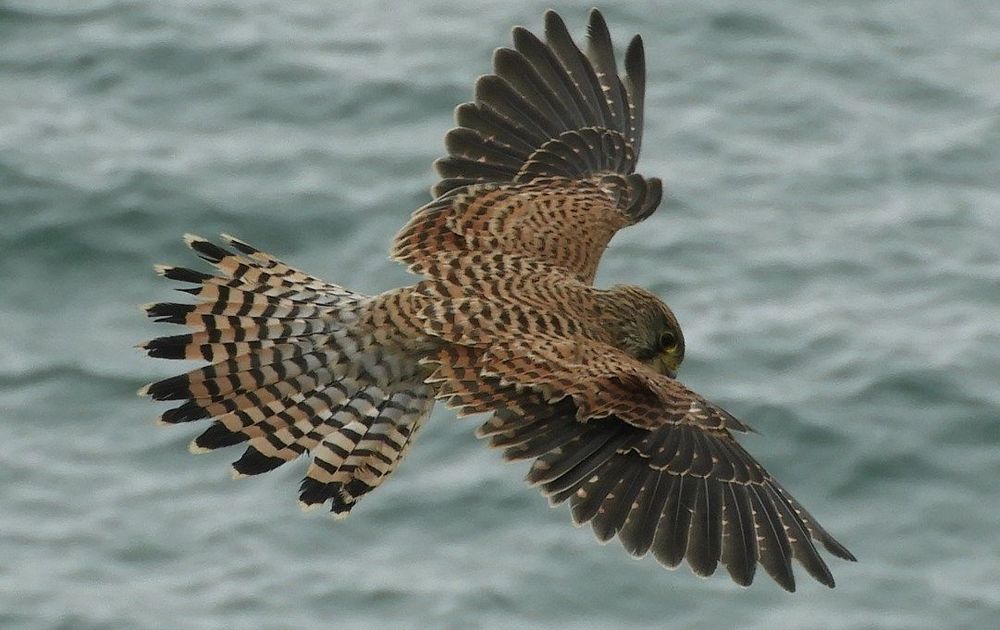 Ik wandelde langs het South West Coast Path in Engeland. Deze Torenvalk maakte gebruik van de wind die tegen de kust 'omhoog' waaide. Hij kon hierdoor staan 'bidden' zonder te hoeven klapwieken. 'Gedragen' door de wind dus. Ik liep nog hoger op de kust vandaar dat ik deze foto van boven kon maken. Mooie foto door deze unieke samenloop van omstandigheden dus.