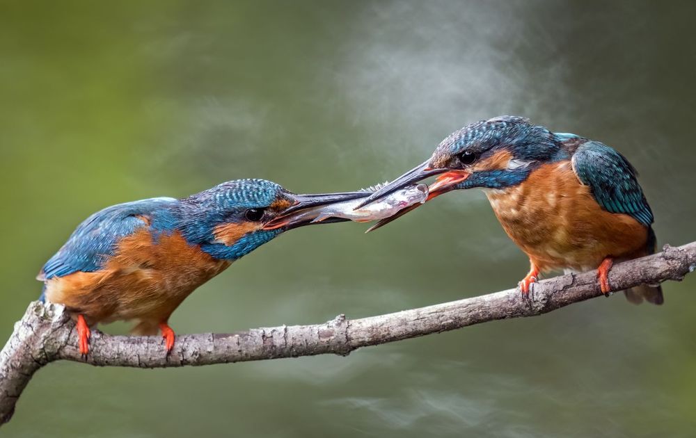 630mm (300mm PF op cropsensor met 1.4 converter), 1/500sec, F4, iso 2000. Je gelooft je eigen ogen niet als dit schouwspel zich op 3 a 4 meter van je afspeelt. Heel voorzichtig boog de male zich toe naar de female en gaf het visje (in de juiste richting, d.w.z. kop eerst) aan de female ijsvogel.