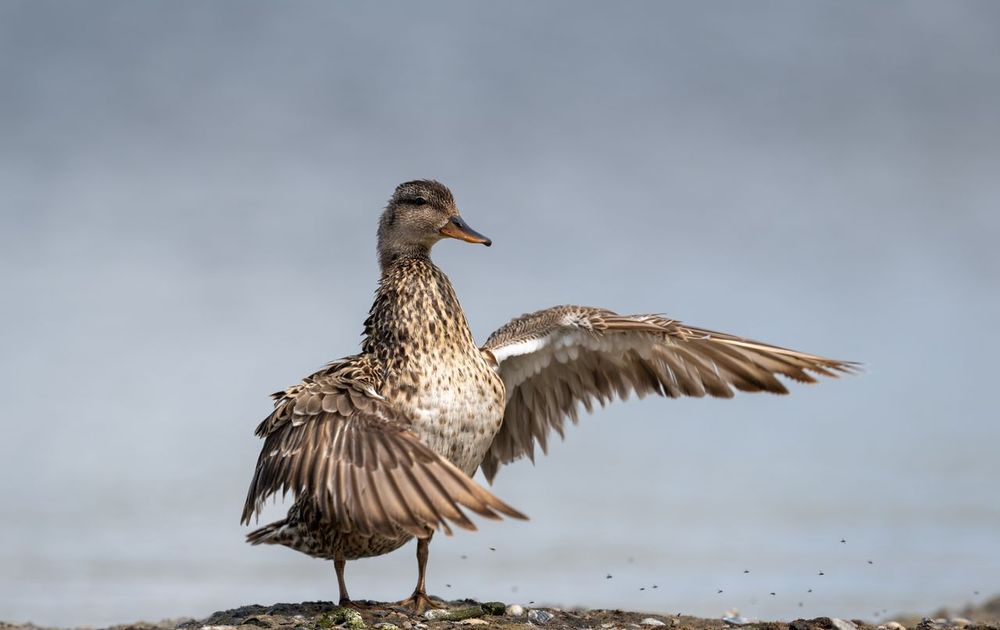Dit vrolijke vrouwtje (de snavel heeft een oranje rand) maakt haar toilet, zodanig dat de vliegen ervan schrikken.