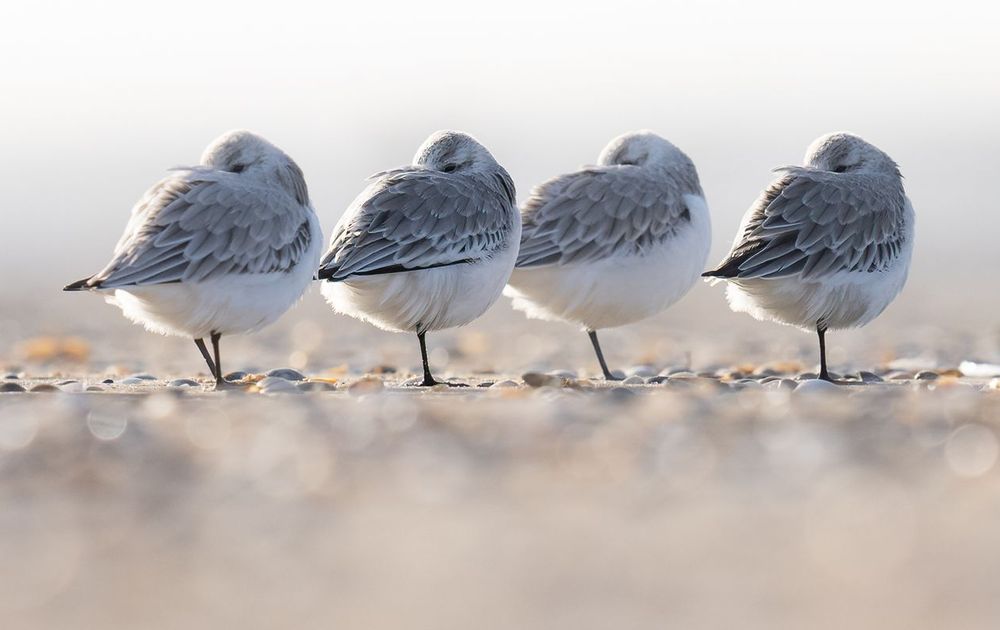 Drieteenstrandlopertjes, vier op een rij, rustend, maar altijd een waakzaam oogje open.