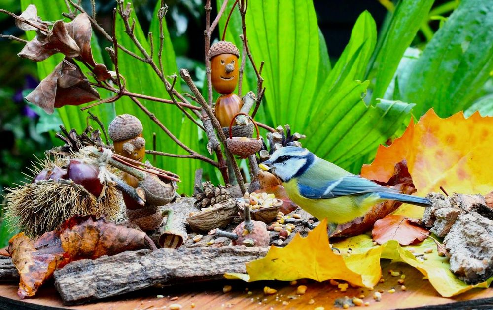 Herfst en vogels, een bijzondere tijd van het jaar. (Wat eigen creativiteit met herfstspullen uit de tuin, wat vogelzaad en zie daar 🙂)