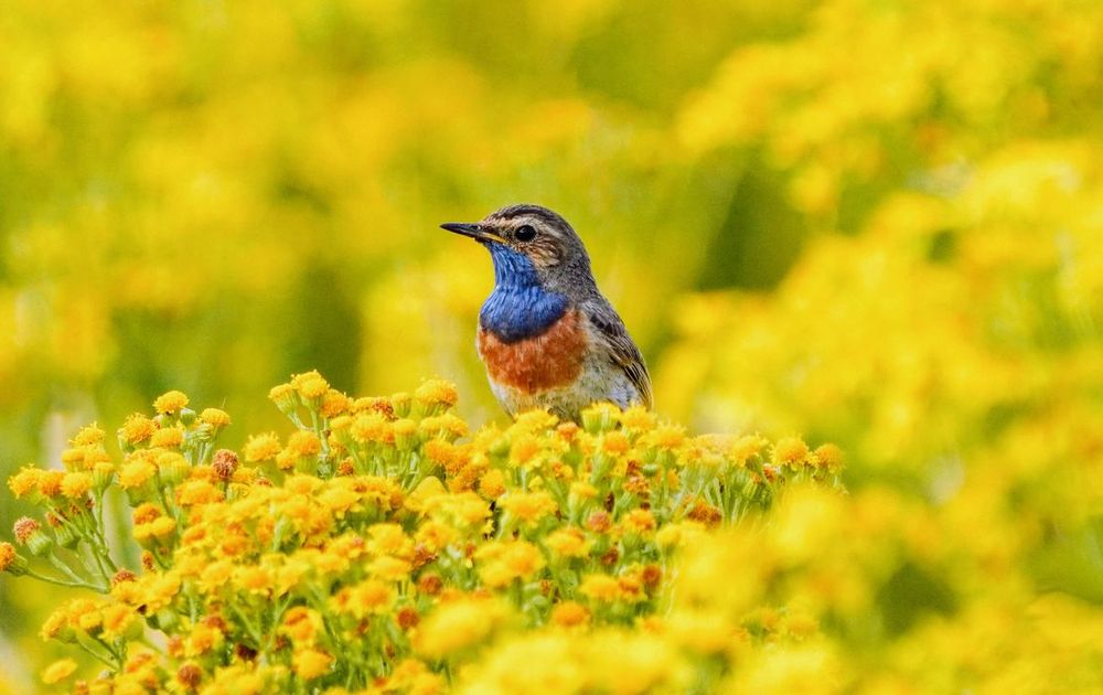 Op een vroege ochtend was ik op weg naar een gebied met riet om de blauwborst te fotograferen, maar hoorde en zag ze in deze gele bloemen.