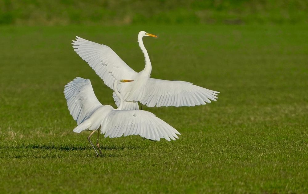 2 vliegende grote zilverreigers leken wel in een dans.