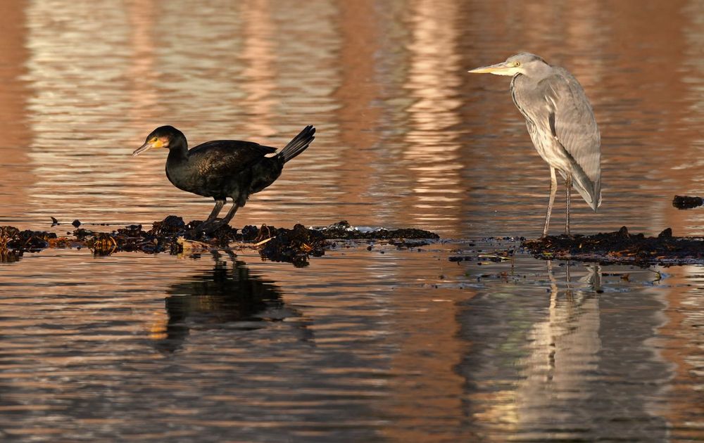 De aalscholver en de jonge blauwe reiger staan naast elkaar op een boomstam in de vijver voor Jachthuis St. Hubertus. Ze konden het niet met elkaar vinden, er was af en toe wat ruzie.