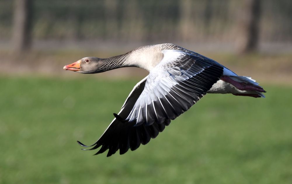 Een grauwe gans verplaatst zich van het Apeldoorns Kanaal naar een belendend weiland.