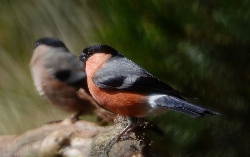 Mijnheer en mevrouw goudvink naast elkaar, zij het niet allebei even scherp. Foto genomen bij een vogelkijkhut.
