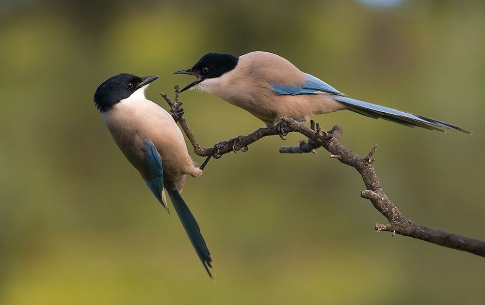 Dit kibbelende tweetal maakte deel uit van een groep van zo'n twintig Blauwe Eksters. Dit moment duurde zo'n vijf รก zes seconden. Ik zag het bgebeuren, en door zeer snel re reageren wist ik dit moment te vereeuwigen. De foto is vanuit een schuilhut gemaakt.